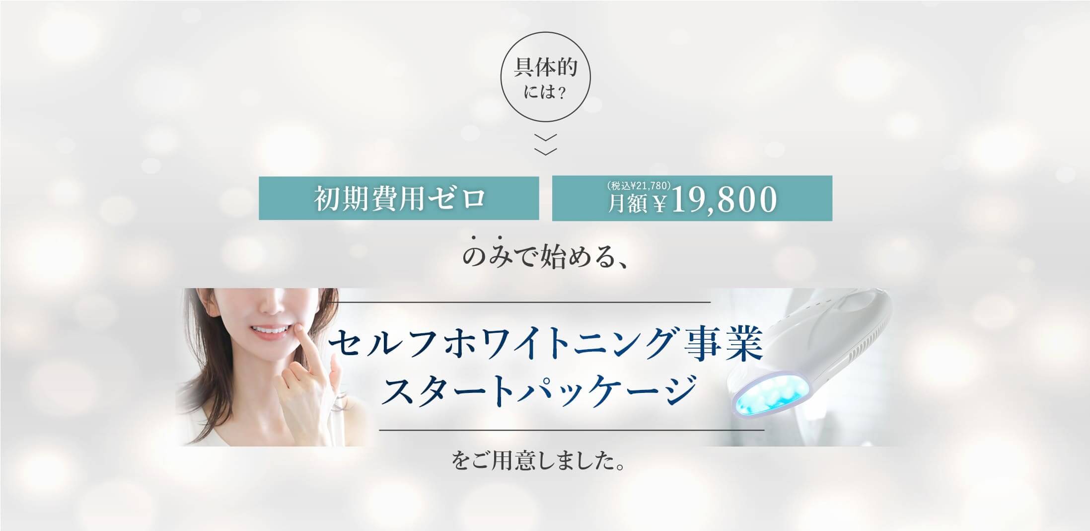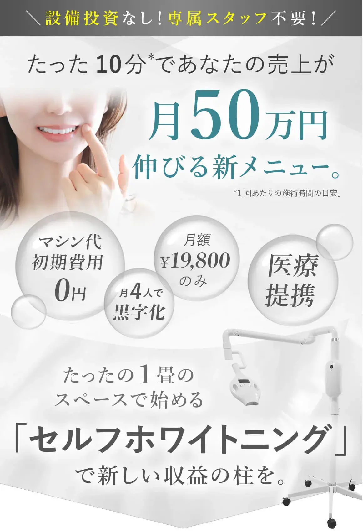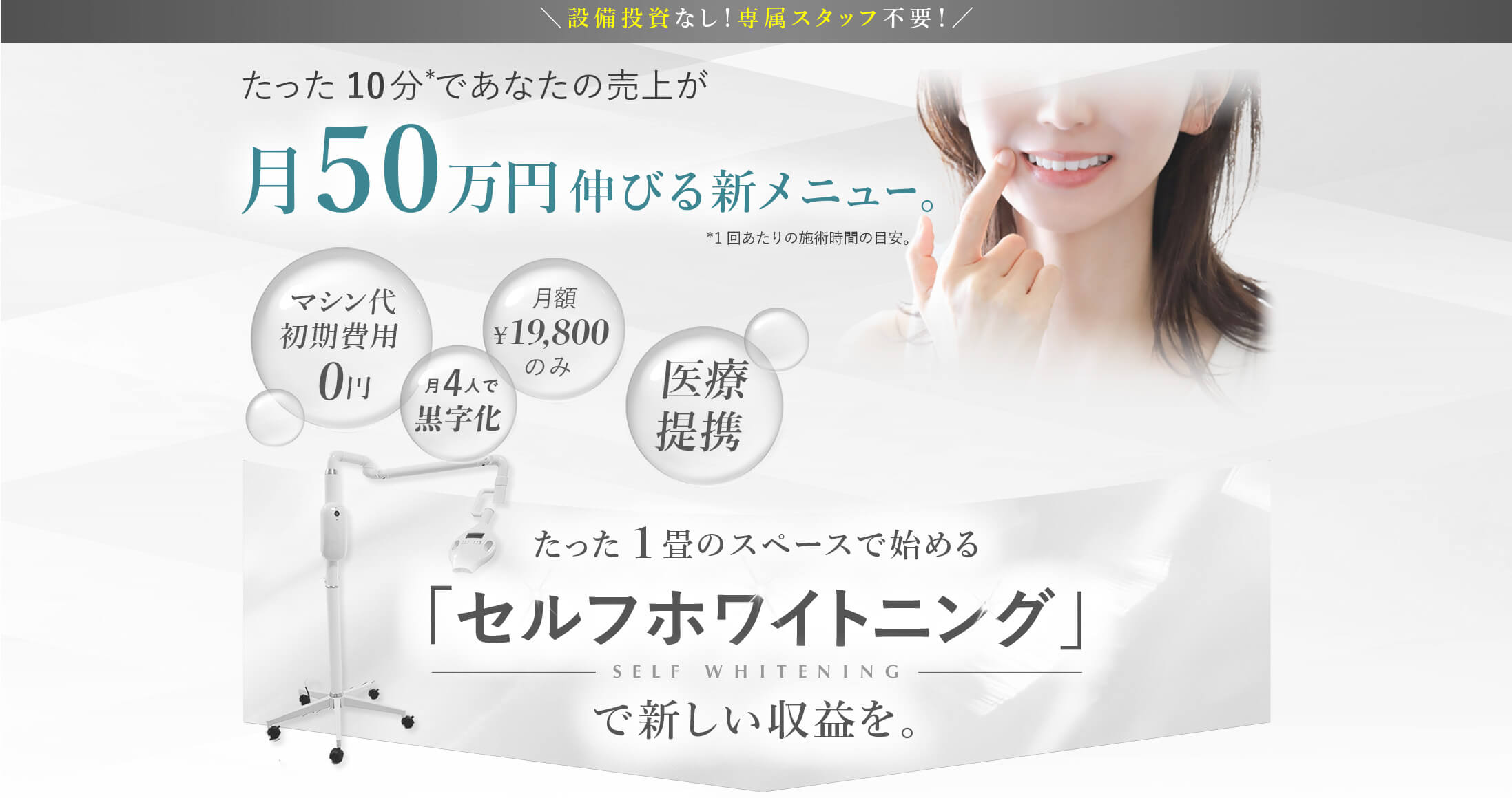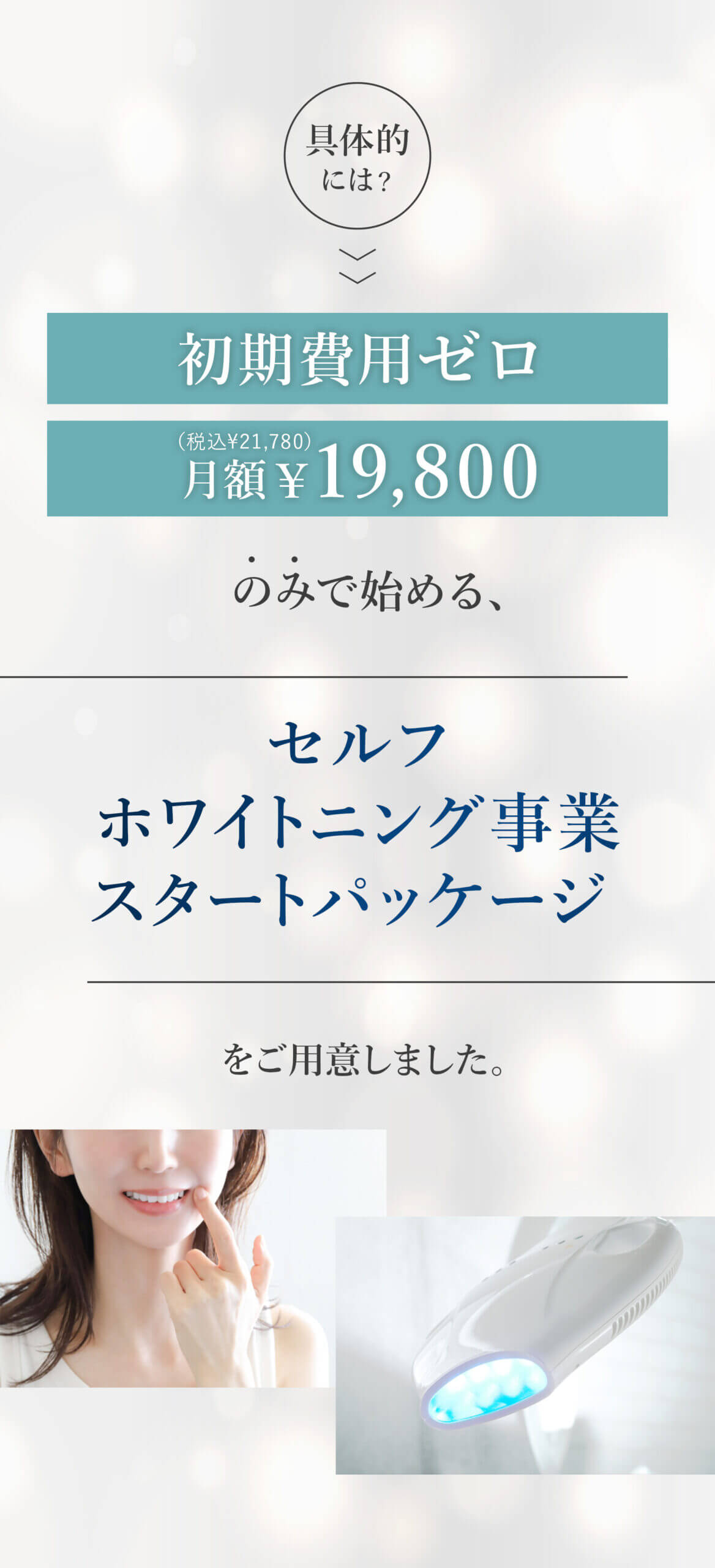 セルフホワイトニングは、基本ご自身で施術されるため、手間がかからず、また体力面での負担もなく運営でき、とても魅力的です。また、月額費用も数人で回収できるので、当月から収益化できました。地方で人口が少ないので心配していましたが、大丈夫でした。